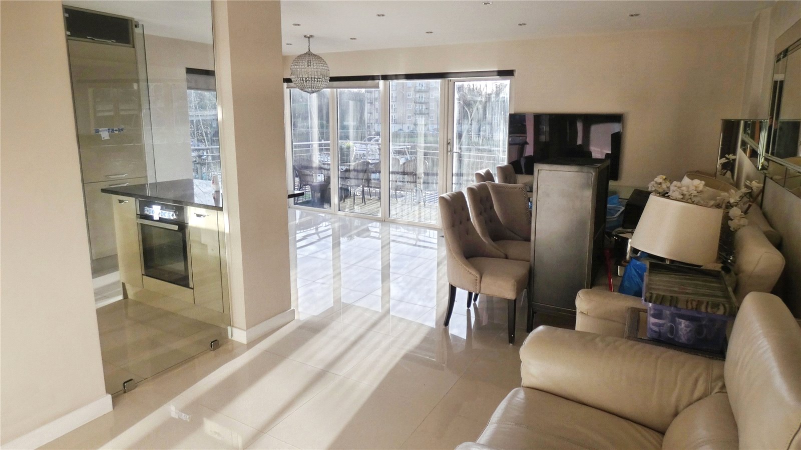 The property features an open-plan kitchen and reception room, designed to maximise natural light and providing access to a balcony, creating a flexible space for living and dining. The kitchen area is integrated within the open-plan layout, with room for everyday cooking and entertaining.