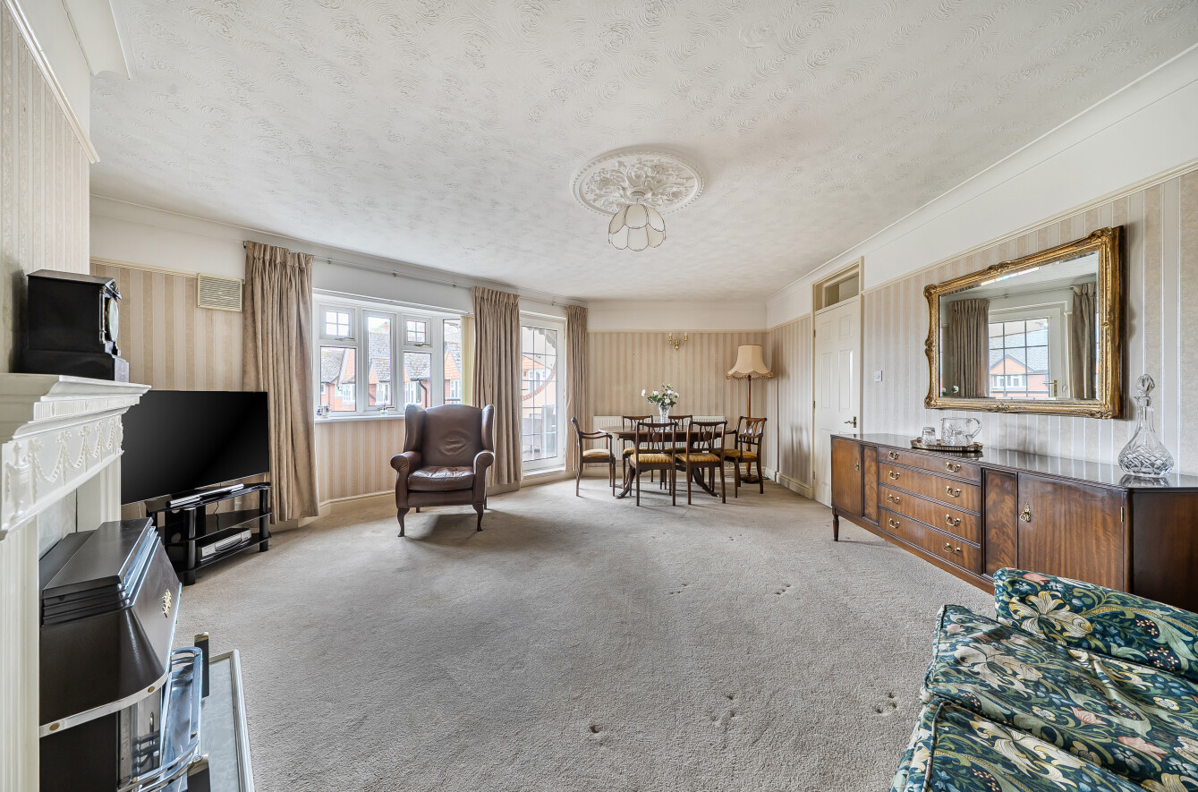 The reception room features large windows and a generous floor area, creating a bright central living space. From here, there is access to a balcony, providing an outdoor area suitable for seating. The flat offers two double bedrooms and one single bedroom, giving flexibility for families, home working or guest accommodation.