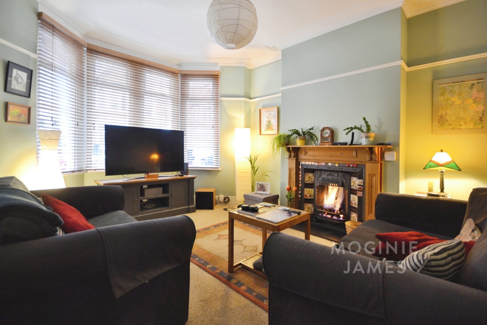 There are three bedrooms: two doubles, including a main bedroom with bay window, and a further single bedroom suitable for a child’s room or home office. The bathroom includes a free-standing bath.
