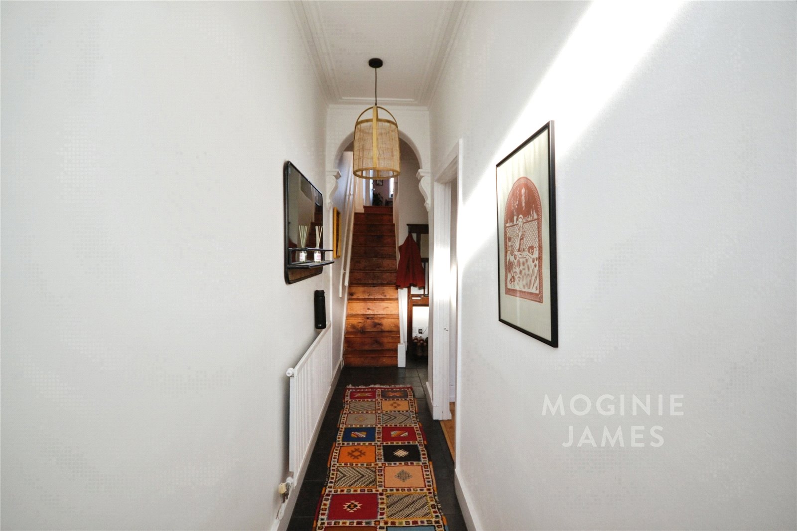 The ground floor comprises two reception rooms, both with wood floors. The front reception features a log burner and provides a comfortable living space. To the rear, the second reception room also has wood flooring, opens directly to the kitchen and offers access to the garden, creating a practical layout for day-to-day living and entertaining. The kitchen includes wood countertops and is open to the dining area. A ground floor wet room and a separate utility room provide additional convenience.