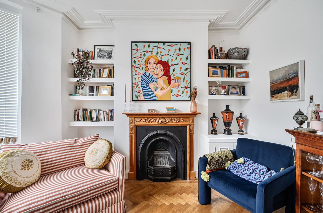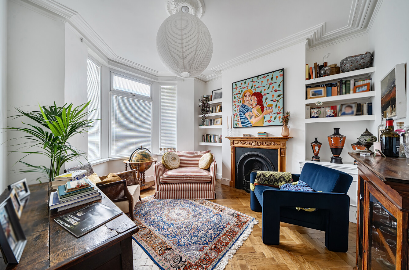 The property provides two reception rooms. The main reception features large windows, a fireplace and wood floors, offering a comfortable living space with good natural light. A second reception room also benefits from a fireplace and wood floors, creating an additional flexible area for living or dining. The open-plan kitchen includes a defined dining space and a useful utility room, providing practical storage and laundry options. There is a modern bathroom serving the property. All three bedrooms are doubles, offering balanced accommodation for couples, families or sharers.