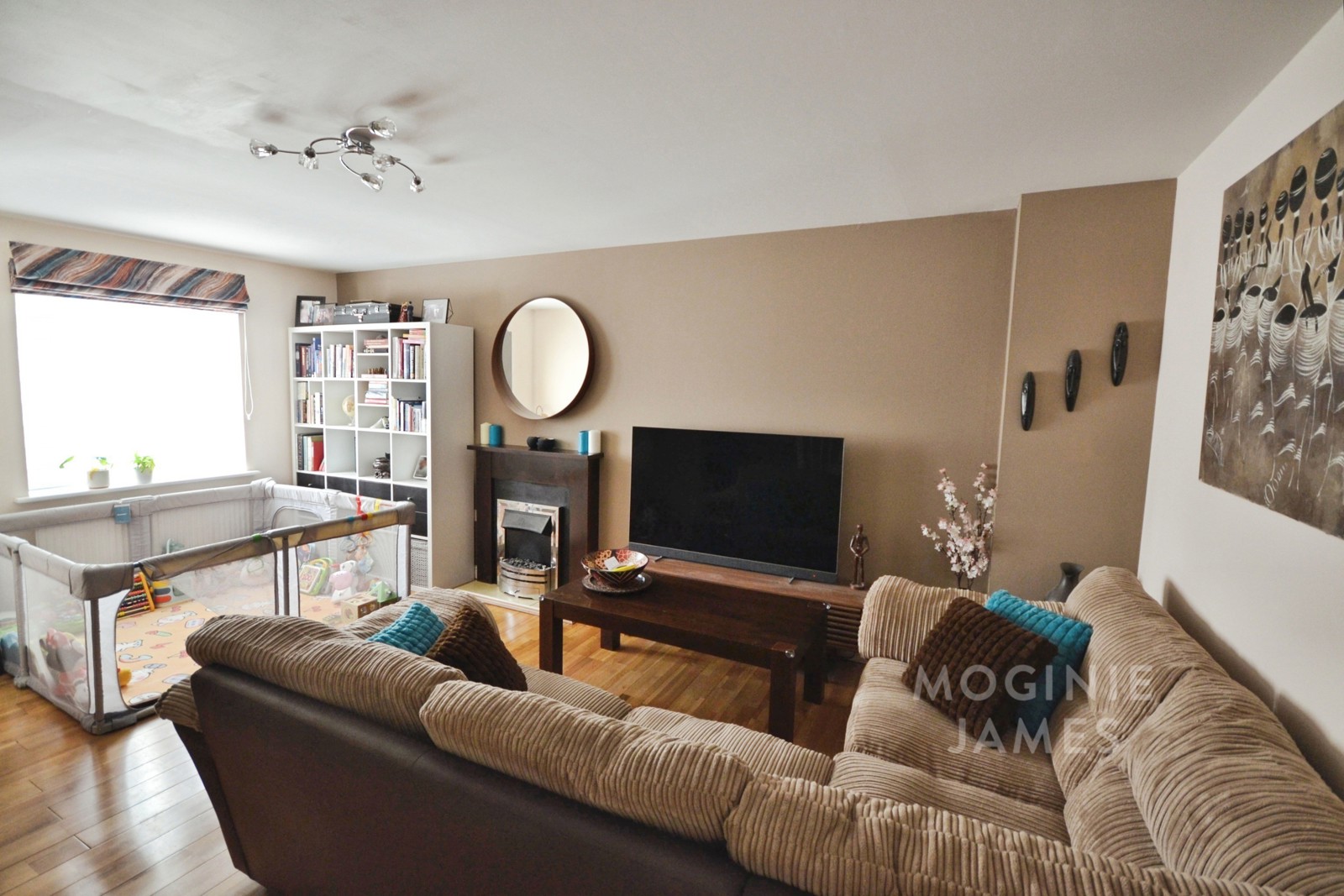 The property provides a single reception room, featuring a fireplace that forms a central focal point and comfortable living space. The main bedroom is a double with en-suite facilities and built-in wardrobes, while the second bedroom is also a double. A third single bedroom offers additional flexibility for a child’s room, home office, or guest space. There are two bathrooms serving the household.