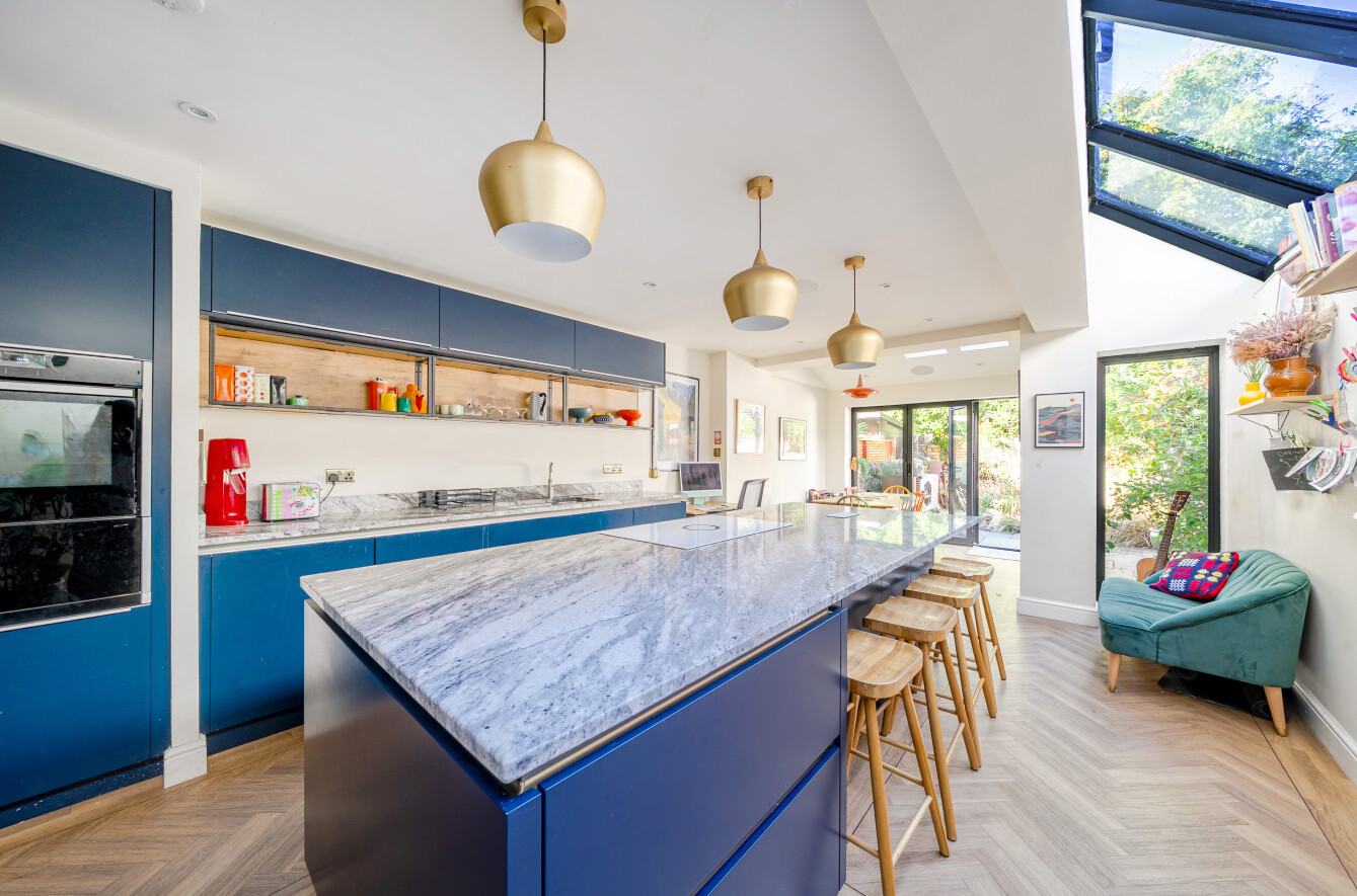 At the heart of the home is a stunning open-plan kitchen and dining space. Flooded with natural light, the kitchen boasts granite countertops, a stylish kitchen island, and bi-fold doors that open onto the garden, ideal for al fresco dining or easy indoor-outdoor living. A practical utility room, side return, and a downstairs toilet add further convenience.