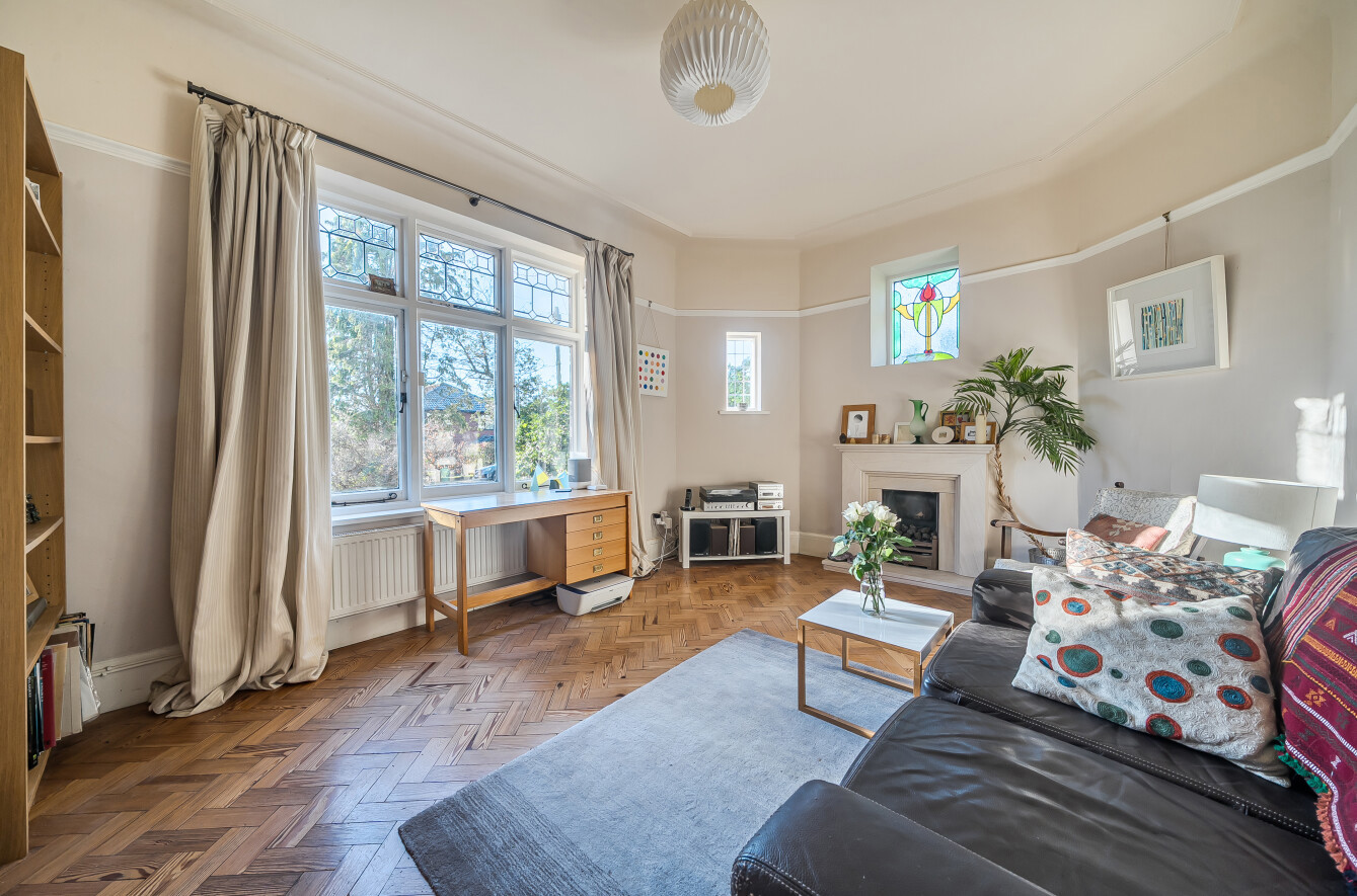 The ground floor offers four well-proportioned reception rooms. One reception room offers large dual aspect windows, a fireplace, wood floors, garden views and direct access to the garden, creating a versatile space for everyday living and entertaining. Additional reception rooms feature wood floors, large windows and fireplaces, while an open-plan reception with dining area links directly to the kitchen.
