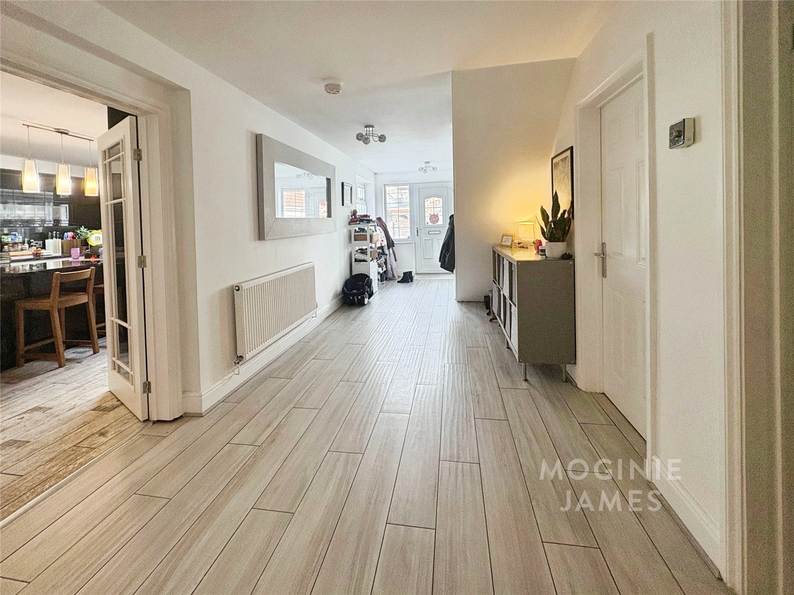The main reception room features large doors providing a pleasant garden view and direct access to the garden, creating a natural hub for family life and entertaining. The well-appointed kitchen includes a kitchen island and a separate utility room, supporting practical day-to-day living. There are three bathrooms, one of which includes a free-standing bath. All four bedrooms are doubles, offering comfortable accommodation for families or sharers. The property also benefits from a log burner, enhancing comfort in the cooler months.